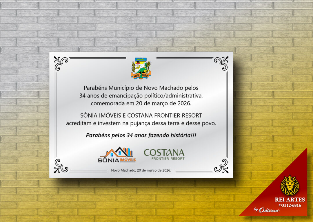 No ato de entrega da placa, o empresário Jorge de Souza Salgadinho, natural do distrito de Vila Pratos, em Novo Machado, enalteceu o desenvolvimento alcançado pelo município, enfatizou a importância da presença da Sônia Imóveis neste momento histórico e parabenizou toda a comunidade pelos 34 anos de emancipação.