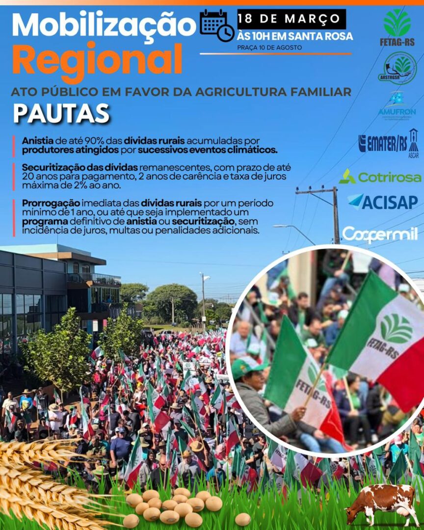 Entidades e sindicatos da região promovem no próximo dia 18 de março, às 10h, um ato público em defesa da agricultura familiar, que será realizado na Praça 10 de Agosto, em Santa Rosa. A mobilização regional pretende reunir produtores rurais, lideranças e representantes do setor agropecuário para discutir e reivindicar medidas emergenciais diante da grave crise enfrentada pelo campo.