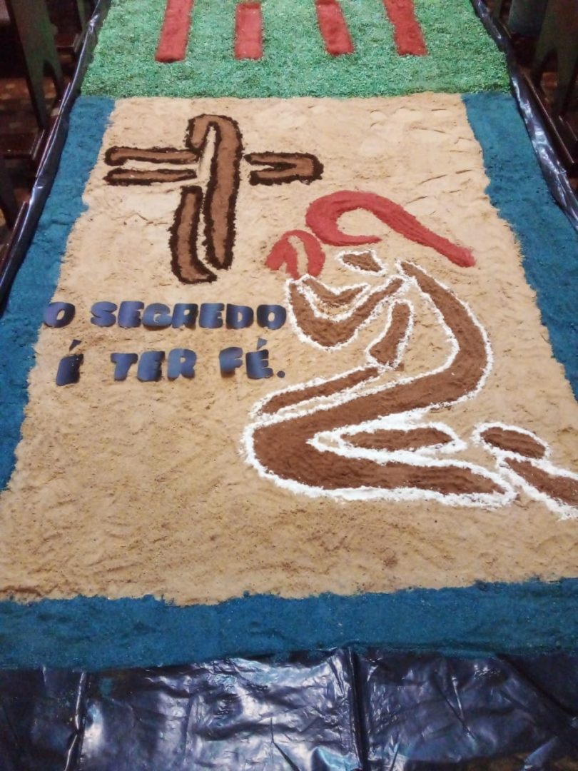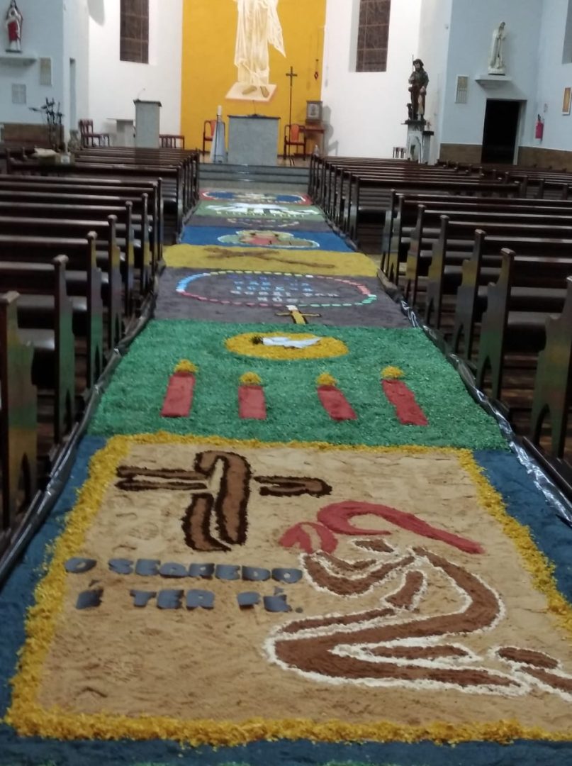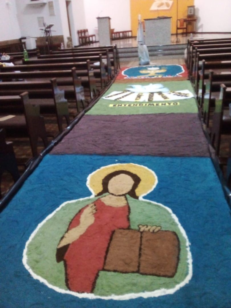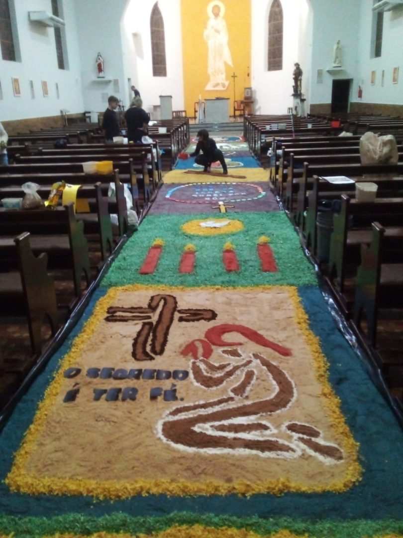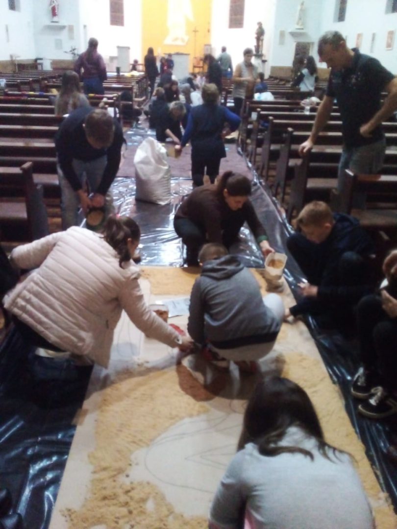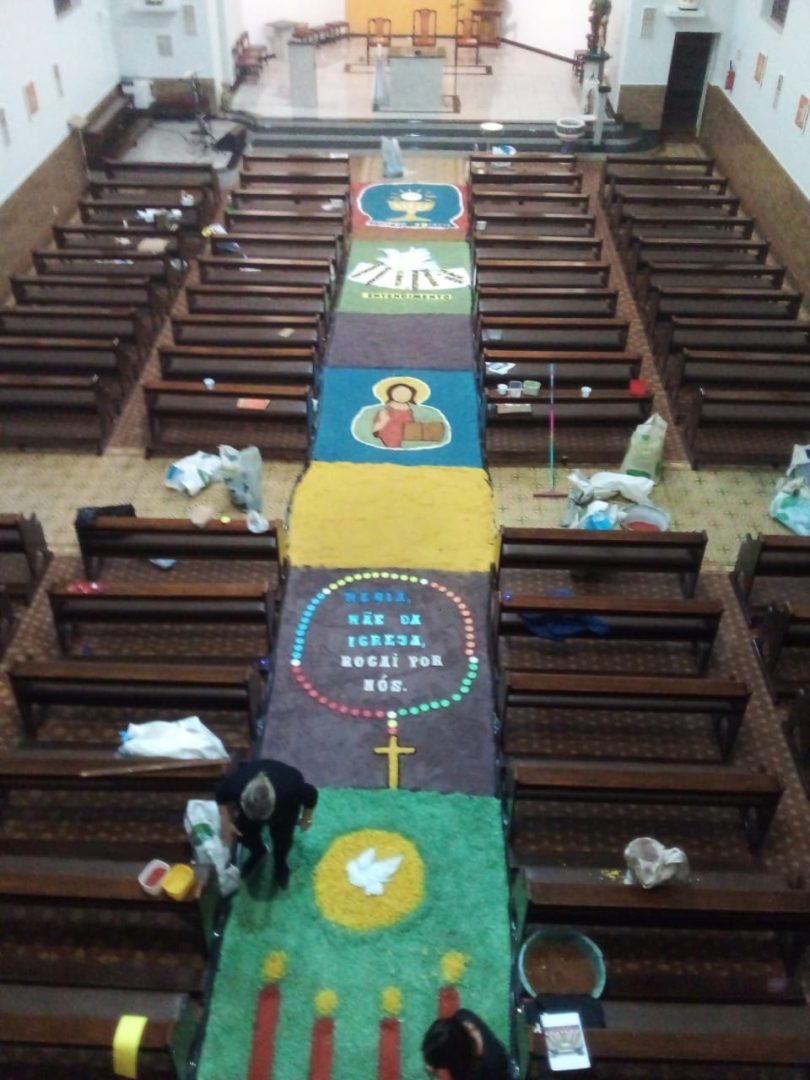 Já está quase tudo pronto para a celebração da Missa de Corpus Christi que acontece nesta quinta, 16, na Igreja Matriz Católica de Tucunduva. No dia de hoje cerca de 30 voluntários trabalharam na confecção dos tradicionais tapetes por onde passarão os fiéis com o “corpo de cristo” durante a celebração. O trabalho que foi executado hoje, começou bem antes, com a escolha dos desenhos, símbolos e a pintura da serragem, material do qual são compostos os tapetes. “Nós temos uma equipe ligada a Igreja que trabalha na confecção destes tapetes há muitos anos. Alguns, como é o meu caso, estão trabalhando como voluntários há mais de 13 anos”, explica a servidora pública Ivete Moz. Ela e o grupo há anos prestam serviço voluntário a Paróquia. Este ano o grupo de voluntários teve o auxílios dos jovens catequistas, que auxiliaram na montagem dos tapetes.
