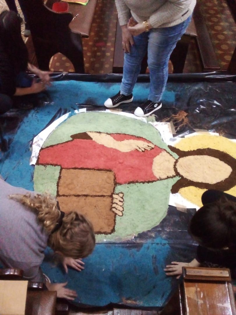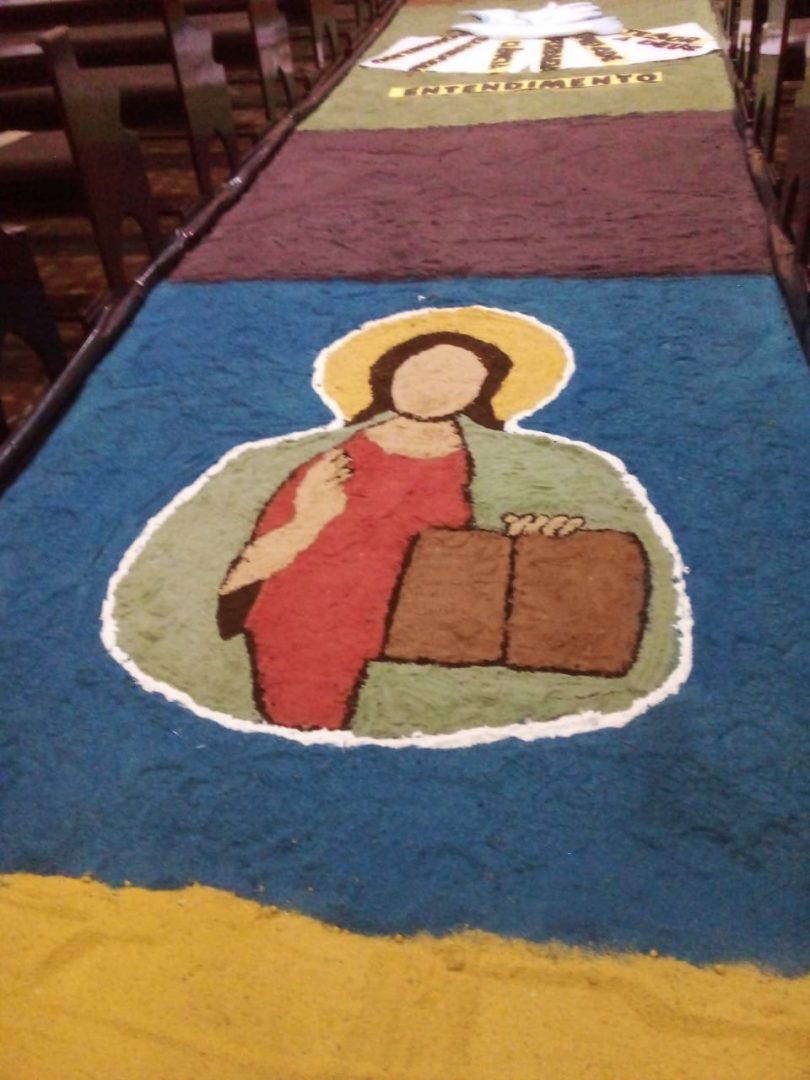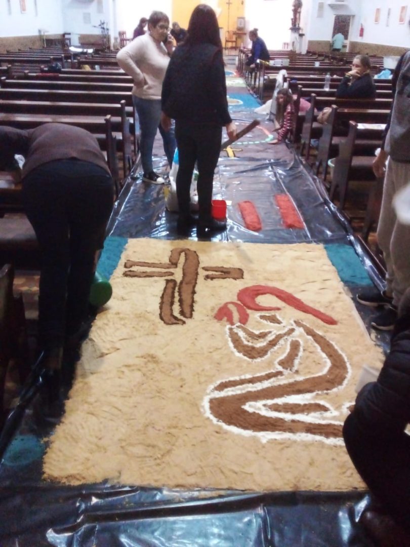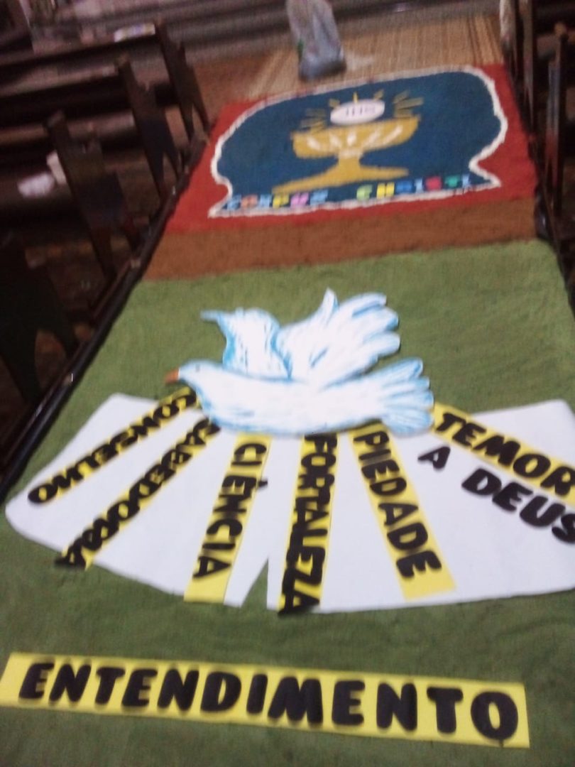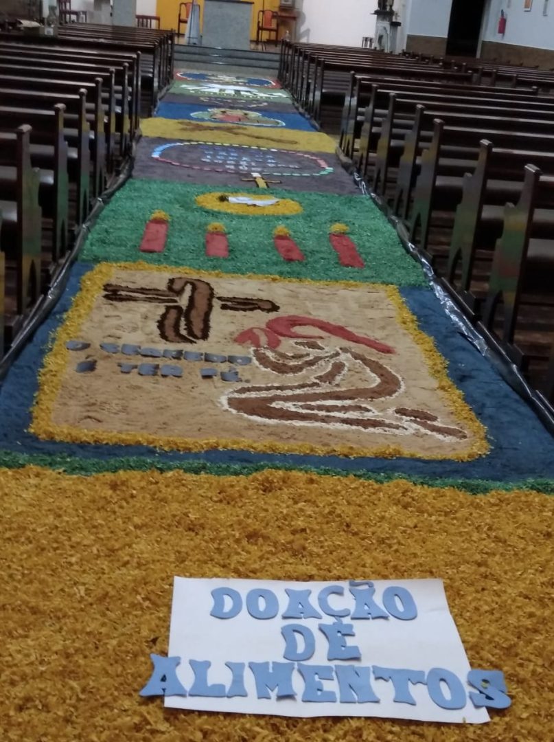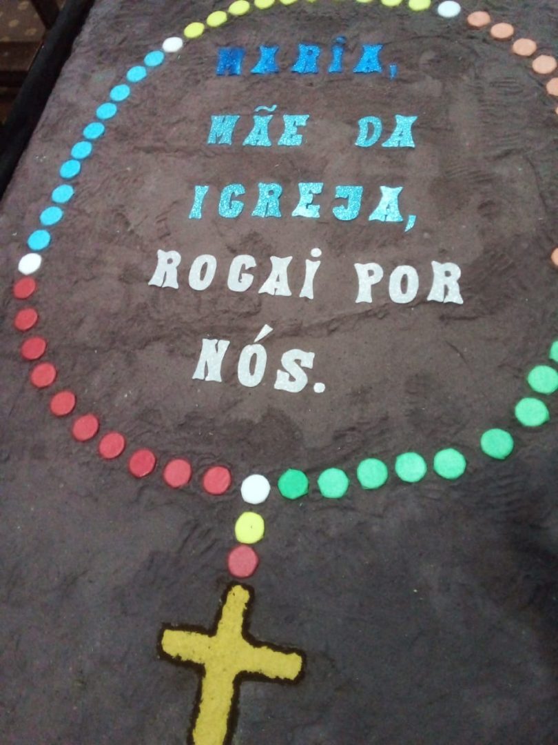 Já está quase tudo pronto para a celebração da Missa de Corpus Christi que acontece nesta quinta, 16, na Igreja Matriz Católica de Tucunduva. No dia de hoje cerca de 30 voluntários trabalharam na confecção dos tradicionais tapetes por onde passarão os fiéis com o “corpo de cristo” durante a celebração. O trabalho que foi executado hoje, começou bem antes, com a escolha dos desenhos, símbolos e a pintura da serragem, material do qual são compostos os tapetes. “Nós temos uma equipe ligada a Igreja que trabalha na confecção destes tapetes há muitos anos. Alguns, como é o meu caso, estão trabalhando como voluntários há mais de 13 anos”, explica a servidora pública Ivete Moz. Ela e o grupo há anos prestam serviço voluntário a Paróquia. Este ano o grupo de voluntários teve o auxílios dos jovens catequistas, que auxiliaram na montagem dos tapetes.
